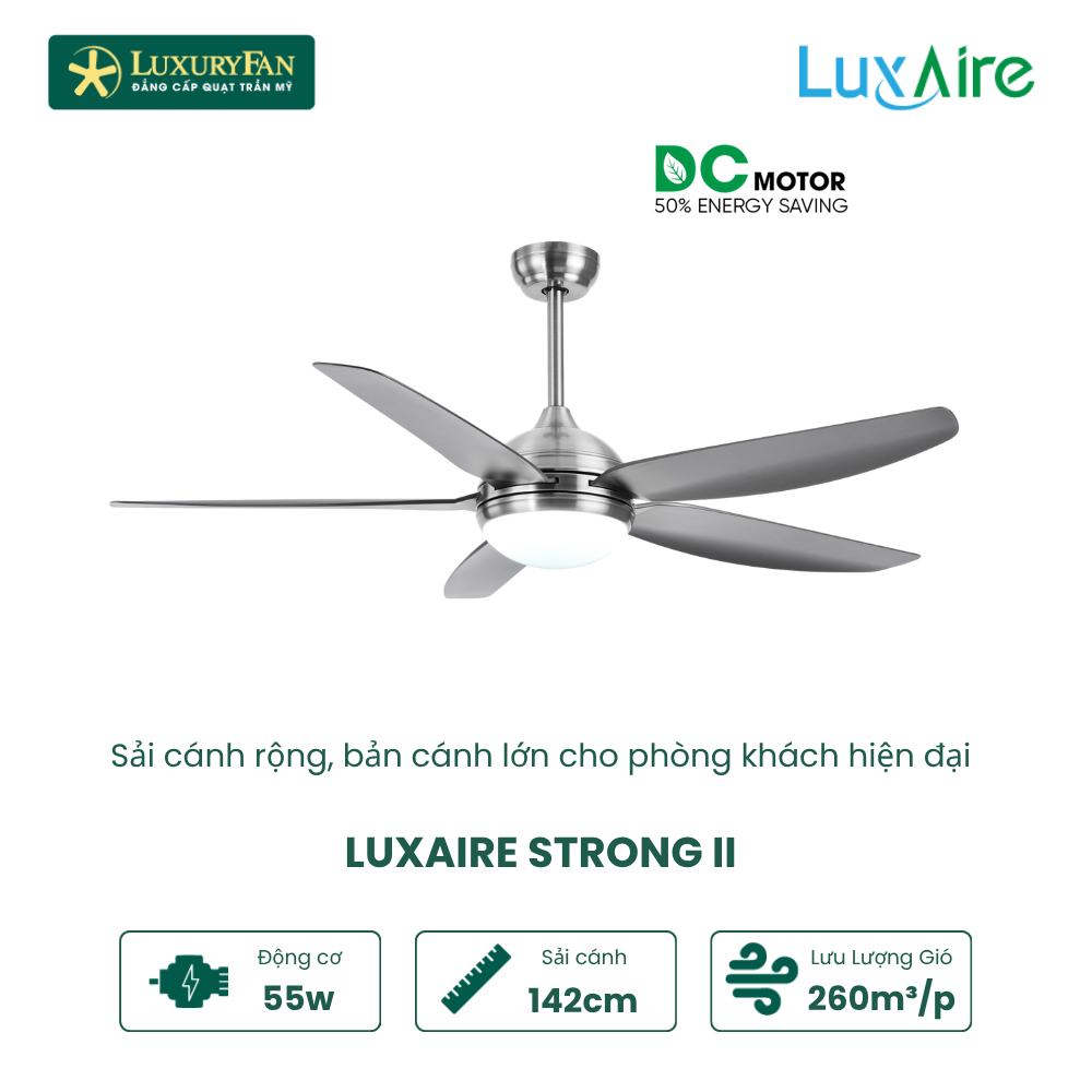 LuxAire Strong II – Một sản phẩm thiết kế phong cách hiện đại, tiện ích và tiết kiệm điện. Từ chất liệu ABS cao cấp, động cơ DC 55W mạnh mẽ, remote điều khiển tiện lợi đến tích hợp đèn LED chiếu sáng đa màu, sản phẩm đã chứng minh được sự đa dạng và linh hoạt trong việc đáp ứng nhu cầu sử dụng của người tiêu dùng.