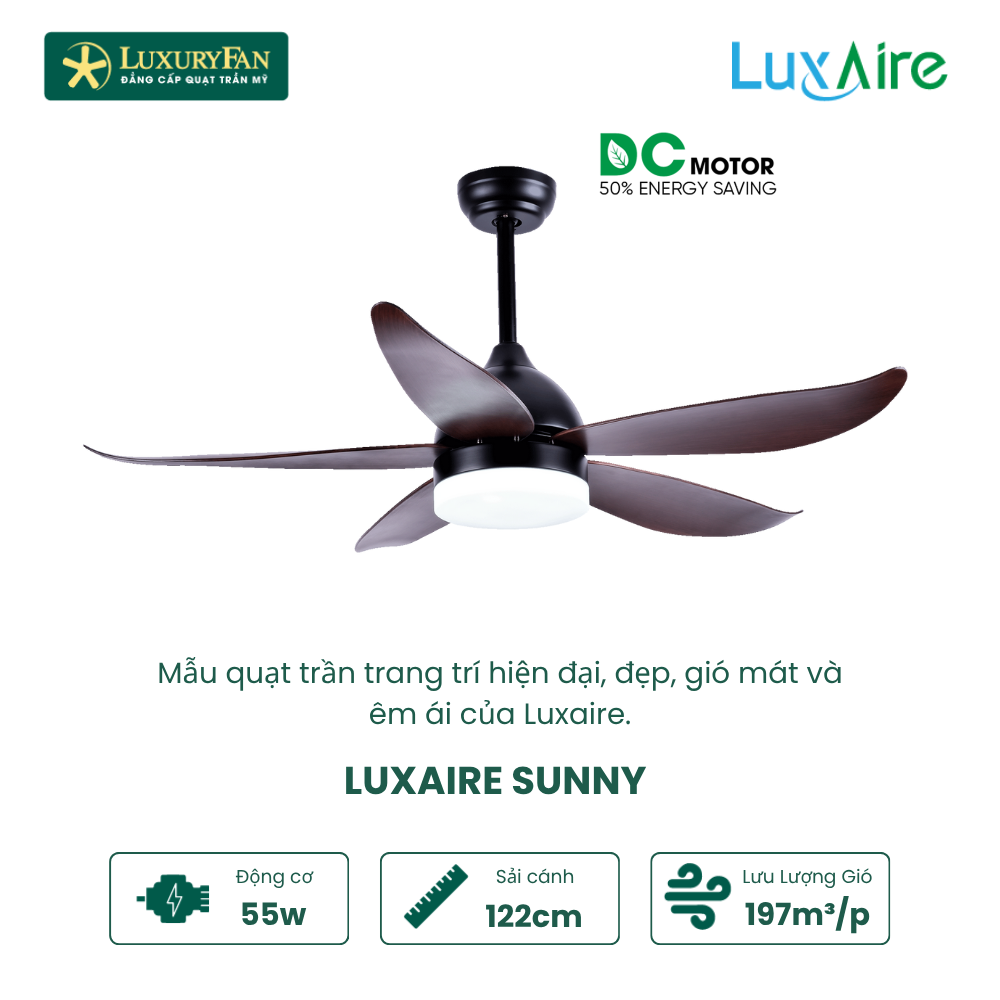 Quạt trần LuxAire Sweep sử dụng động cơ DC (động cơ dòng một chiều) với công suất 55W. Đây là một trong những ưu điểm nổi bật của sản phẩm này. Động cơ DC có nhiều lợi thế so với động cơ truyền thống, như tiết kiệm điện năng, vận hành êm ái và ít gây ồn. Với động cơ DC, quạt trần LuxAire Sweep có thể tiết kiệm đến 70% điện năng so với các thiết bị làm mát khác. Nhờ vậy, bạn không chỉ giảm được chi phí điện hàng tháng mà còn góp phần bảo vệ môi trường bằng cách sử dụng điện năng hiệu quả hơn.