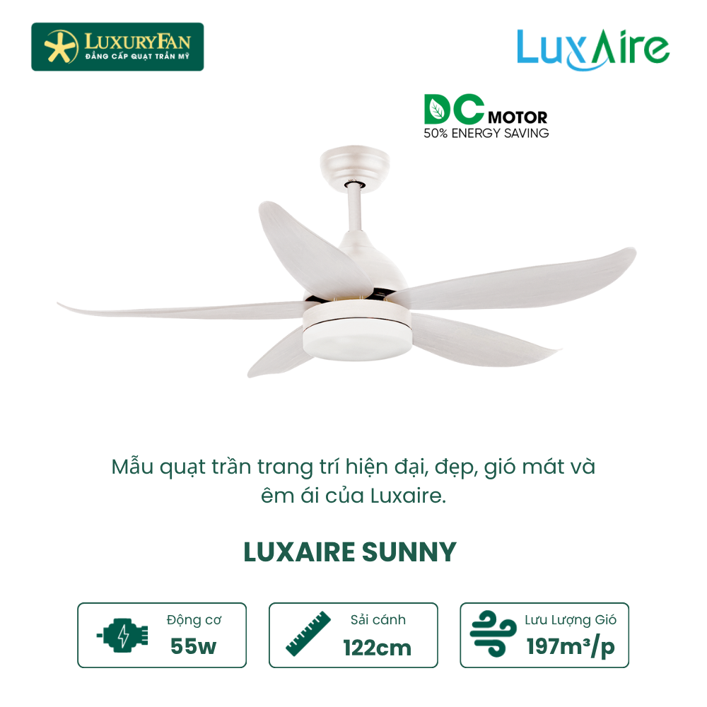 Với thiết kế 6 cánh quạt ABS sải cánh 137cm, động cơ DC 55W gió tốt êm ái, cùng nhiều tính năng thông minh như điều khiển từ xa, đèn LED 3 chế độ màu, quạt trần LuxAire Sweep mang đến sự kết hợp hoàn hảo giữa công năng và thẩm mỹ, làm tăng thêm vẻ đẹp và sự sang trọng cho không gian sống của bạn.