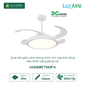 LuxAire Tulip II ngay từ ánh nhìn đầu tiên đã tạo cho người ta cảm nhận về câu chuyện cuộc sống, cảm hứng thiên nhiên ẩn chứa bên trong tác phẩm nghệ thuật này. Ngay từ tên gọi của sản phẩm “Tulip” đã khiến cho người dùng có liên tưởng đến nụ hoa tulip chúm chím, hé nở kín đáo như thiếu nữ e ấp đương tuổi xuân. Chiếc quạt tựa đóa hoa thanh thoát, cất giấu bộ cánh giúp làm mát tối ưu cho không gian.
