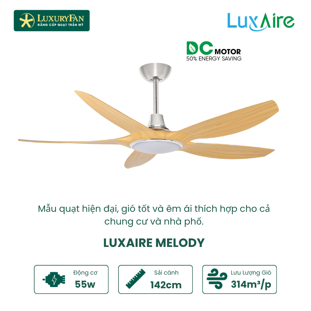 LuxAire Melody được trang bị động cơ DC 55W tiết kiệm điện năng tối đa, làm mát mạnh mẽ với lưu lượng gió đạt 256m3/phút. LuxAire Melody sẽ cho bạn trải nghiệm không gian mát mẻ và thông thoáng nhất. Với sải cánh dài 142cm, LuxAire Melody phù hợp cho các phòng khách chung cư và nhà phố, với diện tích phòng rộng đến 25m2.