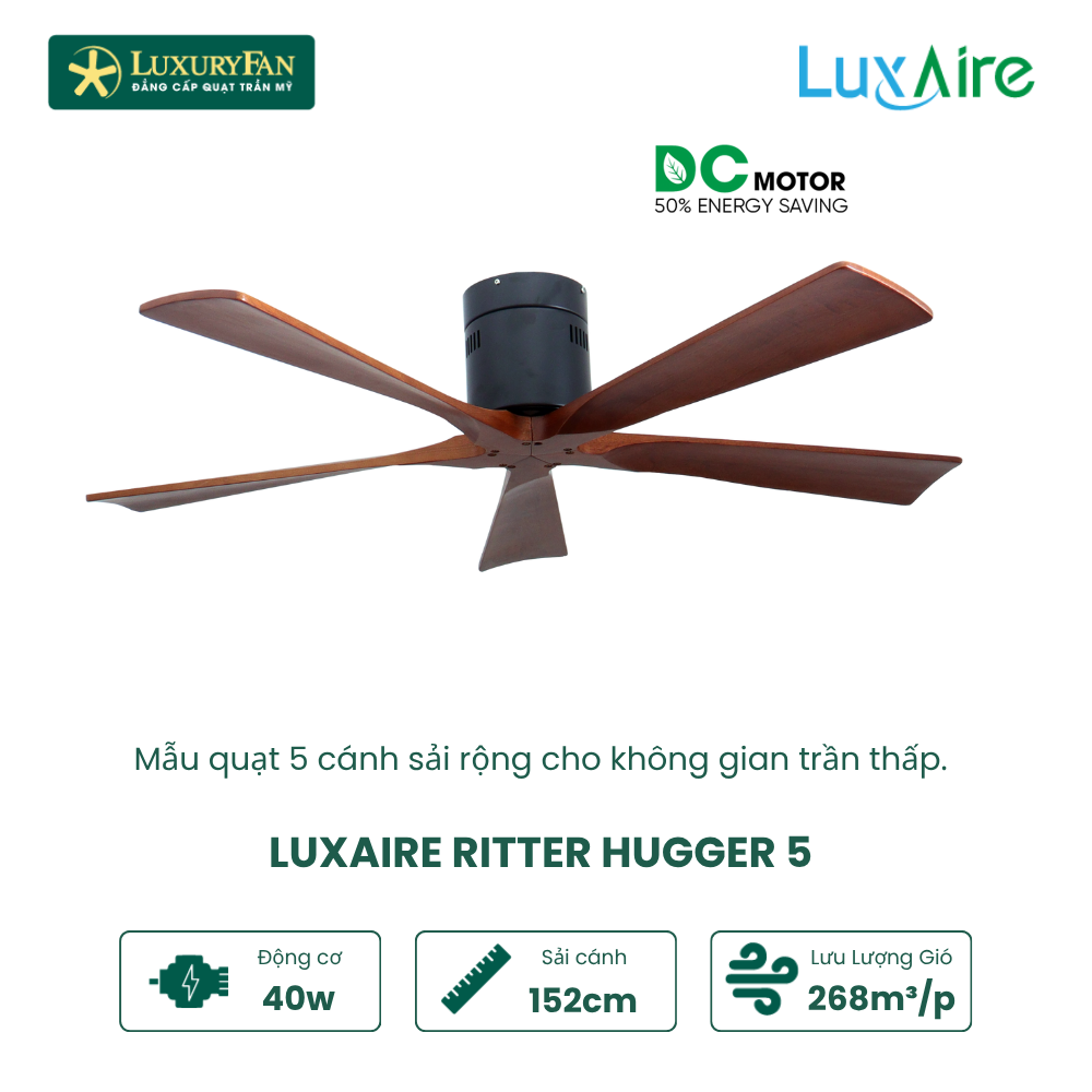 Sau phiên bản 3 cánh được nhiều khách hàng ưa chuộng, LuxAire đã cho ra đời mẫu quạt trần LuxAire Ritter Hugger 5 cải tiến hơn với 5 cánh gỗ tự nhiên, tạo luồng gió mát mẻ và êm ái, mang tới không gian thư giãn, khác biệt với các dòng quạt truyền thống trước đó. LuxAire Ritter Hugger 5 là mẫu quạt hoàn mỹ, vừa có khả năng làm mát, vừa đáp ứng được nhu cầu trang trí của khách hàng.