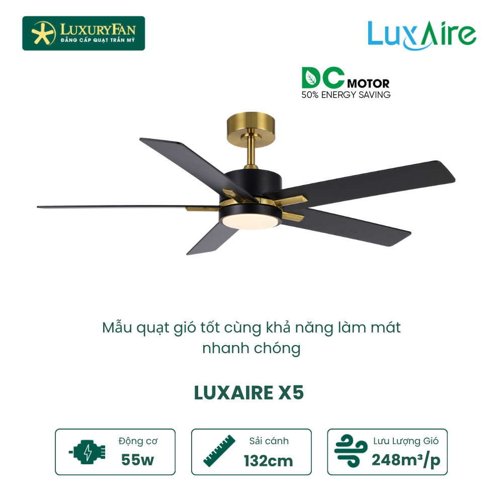 LuxAire X5 là sự kết hợp hoàn hảo giữa hiệu suất làm mát và thiết kế hiện đại. Với động cơ DC Motor 55W mạnh mẽ, quạt có khả năng tạo ra lưu lượng gió lên đến 247 m3/phút, đảm bảo làm mát nhanh chóng và hiệu quả cho cả những không gian rộng lớn. Đặc biệt, động cơ này vận hành êm ái, mang lại trải nghiệm sử dụng thoải mái và yên tĩnh cho người dùng.
