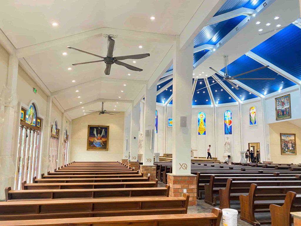 Việc lắp đặt quạt trần công nghiệp trên cao không chỉ tối ưu không gian mà còn góp phần tạo cảm giác thoáng đãng, trang trọng, giữ nguyên vẻ đẹp tôn nghiêm vốn có của nhà thờ.